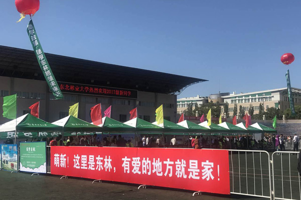 虽然今年是第一次将迎新场地设在田径场,但整体的布局设计体现出了很强的合理性,整齐有序、氛围浓厚。“萌新!这里是东林,有爱的地方就是家”“亲,报到不丢行李,军训不掉链子,请跨好大学第一步”等醒目的标语更成为大家朋友圈中转发的热点。学生志愿者在“欢迎2017级新同学”大背景墙前设立的“新生合影留念”服务,更是为近千名新生和家长拍下了“东林第一照”。为了让新生们在最短的时间了解他们即将开始的大学生活,各学院结合自身特色,别出心裁的“创意小点”也给新生们留下了深刻印象。有的学院设计了特色背景墙,有的学院派出了卡通人物,有的学院举办了“草坪家长见面会”,有的学院成立了“新生接新生”服务小分队,有的学院安排老生分别和新生对接实现精准迎新,在暑假期间遭受地震灾害的新生充分感受到了东北林业大学“人没入校、爱心先到”的暖心情怀,可谓创意无限、各显神通。