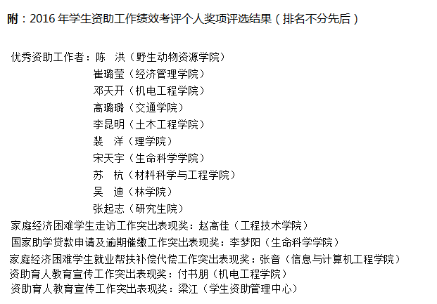 15个学院按照抽签顺序分别从经济困难学生家庭走访、国家奖助学金评定、贷款还款及催缴质量、学生资助育人活动成效、家庭经济困难学生就业帮扶、开发社会资助、发表资助相关研究成果等方面全面且有所侧重地向各位评审及与会同仁展示了2016年学院学生资助工作开展情况。最终,结合家庭经济困难学生工作领导小组成员现场评分、日常工作书面材料评分、各学院现场互评,研究生院获评总分第一名,基于考评方案的参照原则,该院提出不参与集体奖项的评定,但充分展示了我校研究生资助工作的良好工作水平。本科学院排名前三的生命科学学院、经济管理学院、交通学院在2016年学生资助工作绩效考评中获评“优秀”。学生资助绩效考核总成绩排名前70%的学院将获得绩效奖励。