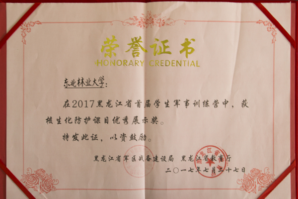 7月21日至27日,黑龙江省首届学生军事训练营在黑龙江省军区综合训练队成功举办。代表学校参加训练的我校8名学生与省内其余9所高校的学生代表一同参加了训练。在带队教师赵高佳的率领下,8位同学积极参与,精诚合作,刻苦训练,为学校赢得了“优胜单位奖”、“核生化防护课目优秀展示奖”等两项集体荣誉、四项个人荣誉。
