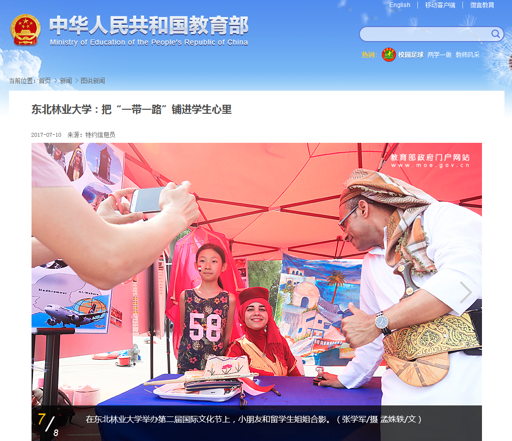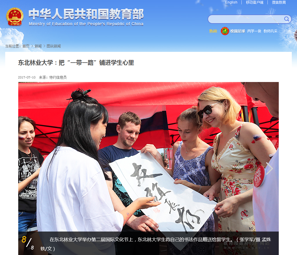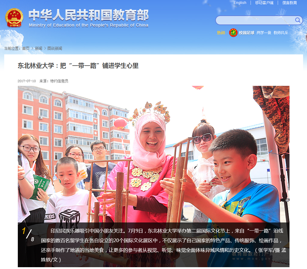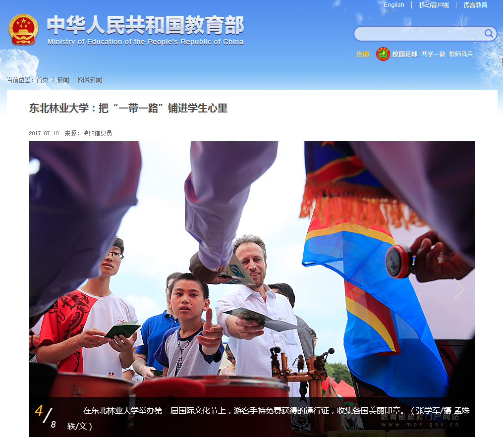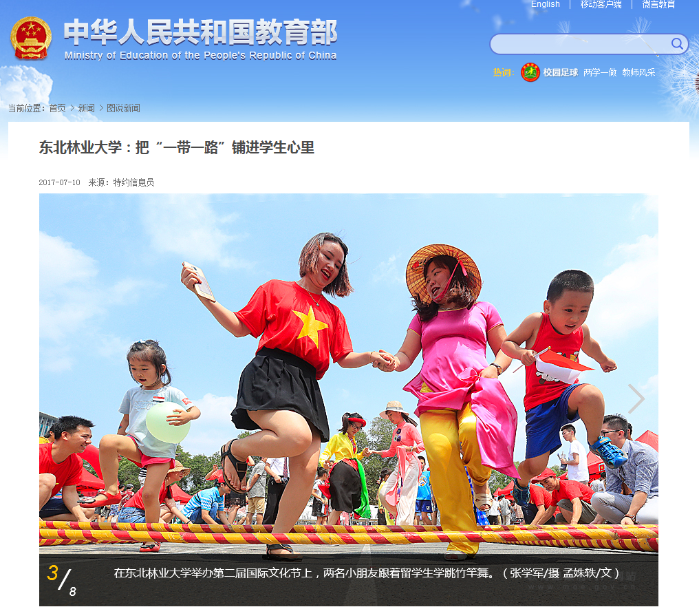 7月11日,教育部网站在首页焦点图片位置刊发《把“一带一路”铺进学生心里》8张系列图片,全方位、多角度地报道了我校第二届国际文化节的盛况。