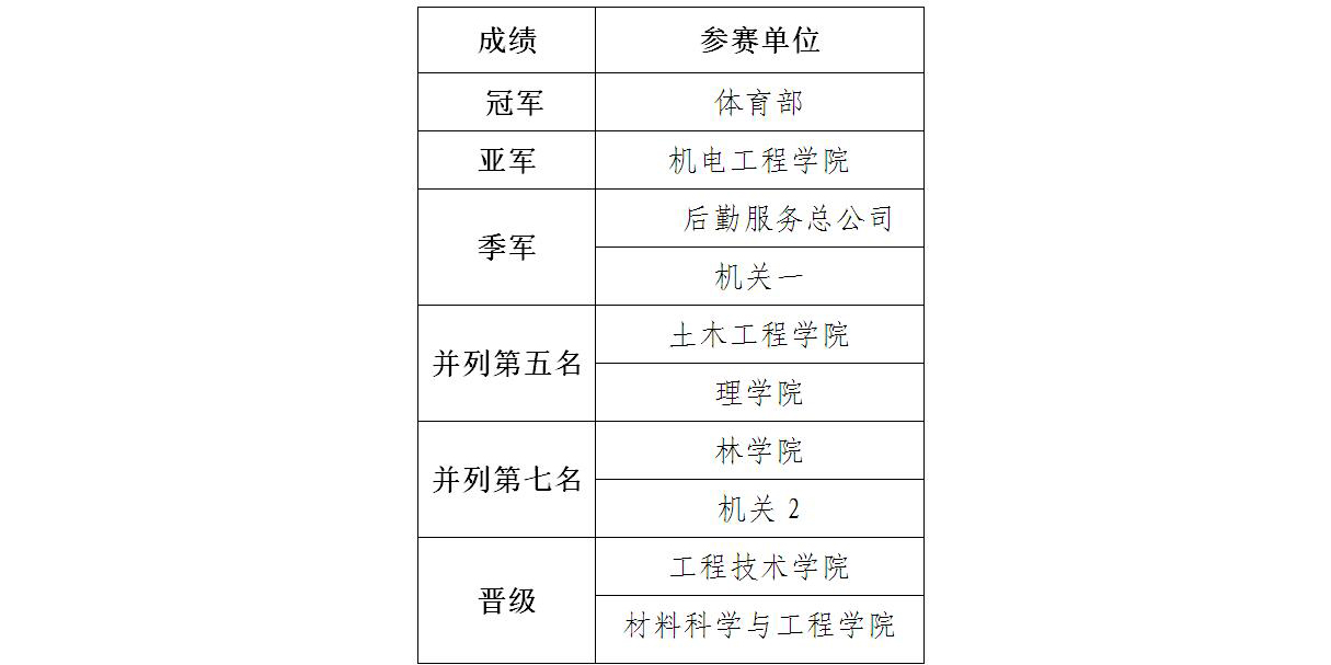 我校2017年教职工篮球赛于6月26日下午在学校体育馆圆满落下帷幕。体育部代表队获得冠军,机电工程学院获亚军,后勤服务总公司与机关一获季军。工程技术学院、材料科学与工程学院晋升甲级队。