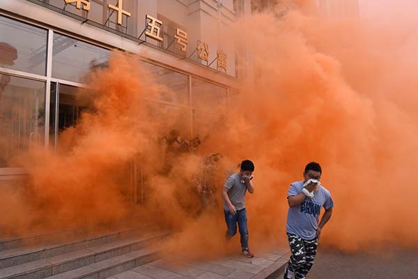 6月16日中午,在学生公寓15号楼门前,滚滚浓烟喷薄而出,刺鼻烟味扑面而来。这个场景并非真实险情,而是学校为了让同学们增强自防自救能力举行的火灾应急疏散演练。为了减少灾害损失,让学生们可以在亲身体验中掌握消防知识,学校在学生公寓15号楼组织了这场演练。