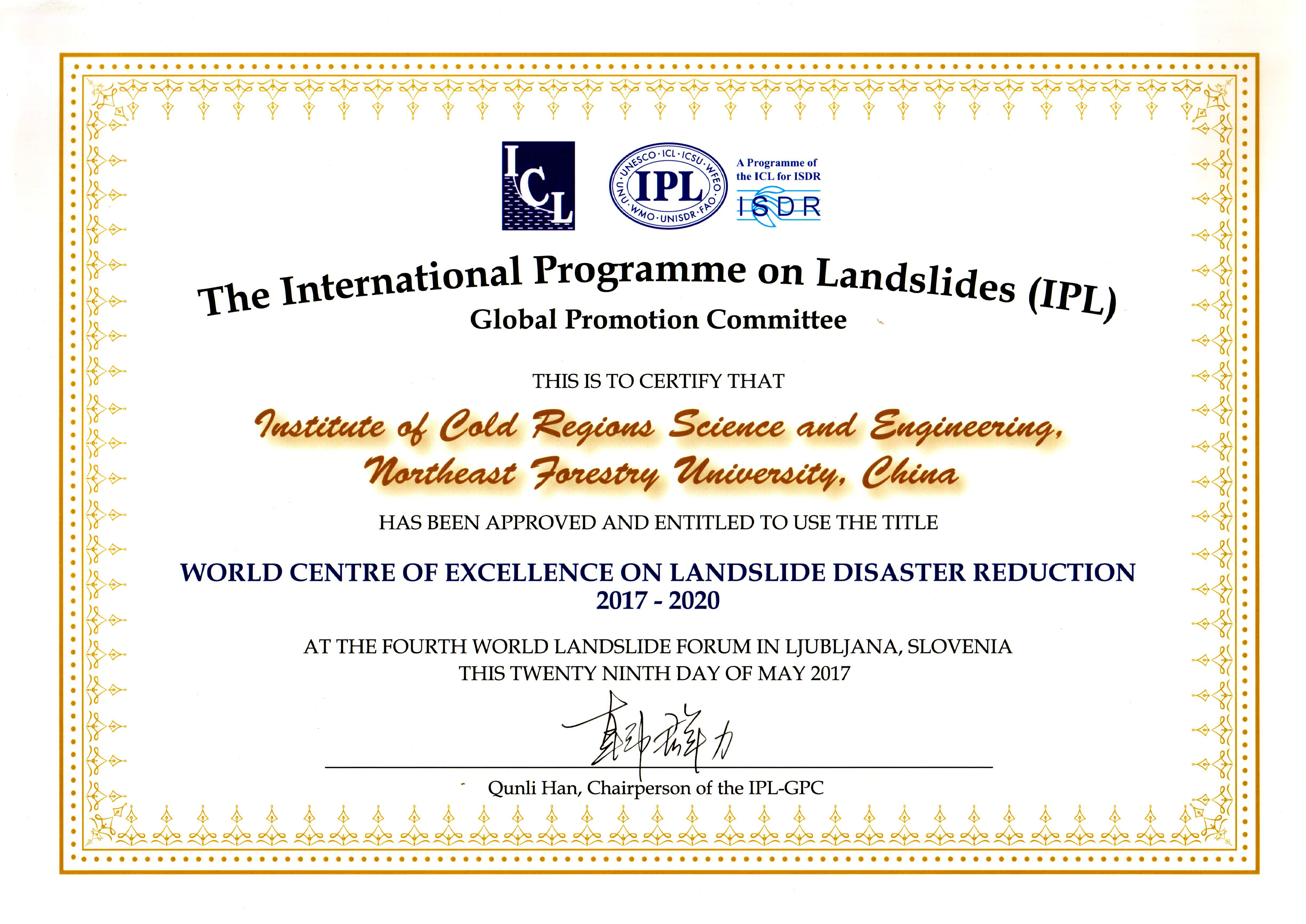 “东北林业大学寒区科学与工程研究院:2017-2020滑坡减灾全球卓越中心”证书