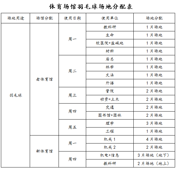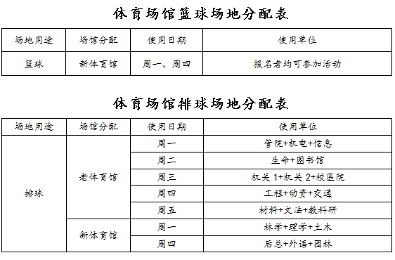 学校决定,从本月15日起,新、老体育馆今起部分时间向教职工免费开放。具体安排是:每周一至周五中午11:40—13:30(老馆),每周一和周四中午11:40—13:30(新馆)篮球、排球、羽毛球场地,向我校工会会员免费开放。