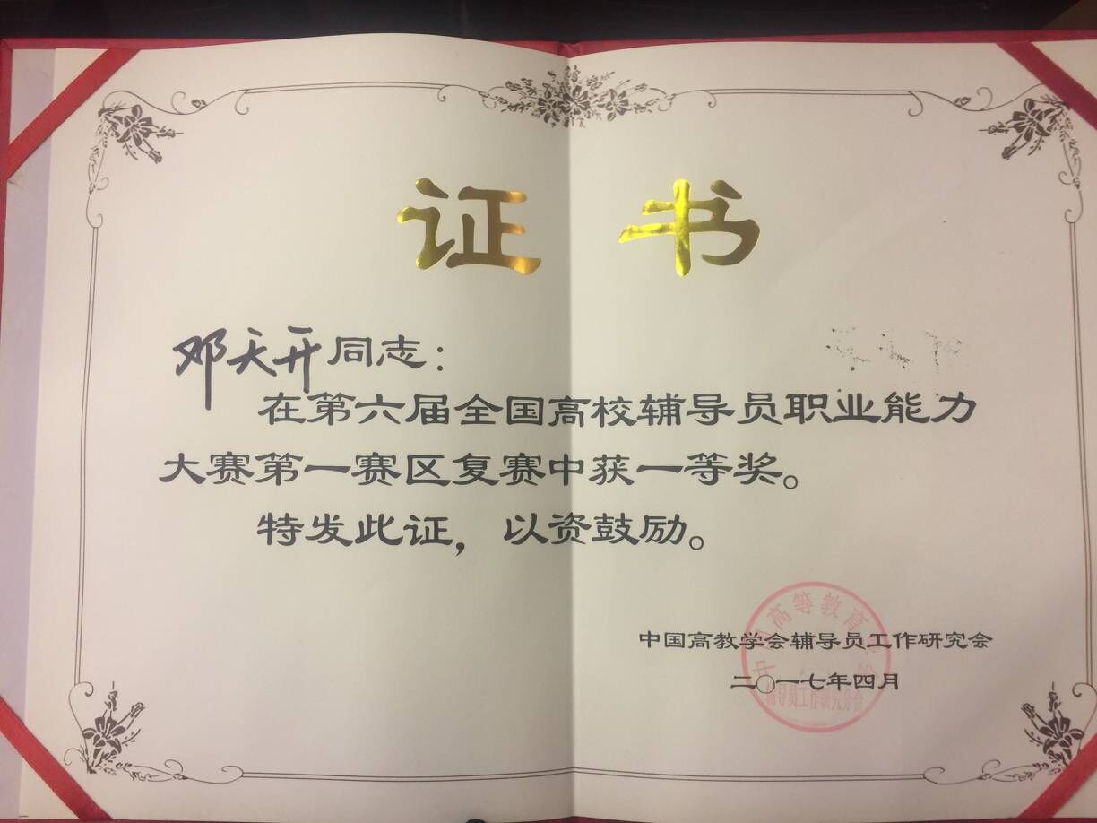 本次在大连理工大学举行的第一赛区复赛共来自黑龙江省、辽宁省、吉林省、天津市、内蒙古自治区五省(区)的50名优秀辅导员参加。邓天开老师以省赛第七名的成绩代表黑龙江省参加本次复赛。大赛分两个阶段进行,采取阶段定额淘汰制。第一阶段为主题班会评比、笔试、案例分析三个项目,邓天开老师发挥平稳,以第12名进入第二阶段决赛。第二阶段为主题(即兴)演讲和谈心谈话两个项目,邓天开老师在决赛的主题(即兴)演讲环节中大胆选择了即兴演讲,围绕“坚定信念,放飞理想”这一主题,结合自身工作中的典型故事自信发挥,拿到全场最高分。在接下来的谈心谈话环节中,针对男生因为恋爱问题产生的心理问题,邓天开老师循循善诱,摆事实、讲道理、谈感情,以出色的谈话再次拿到本环节第一名。最终综合两个阶段的成绩,邓天开老师以总成绩第三名获得一等奖。