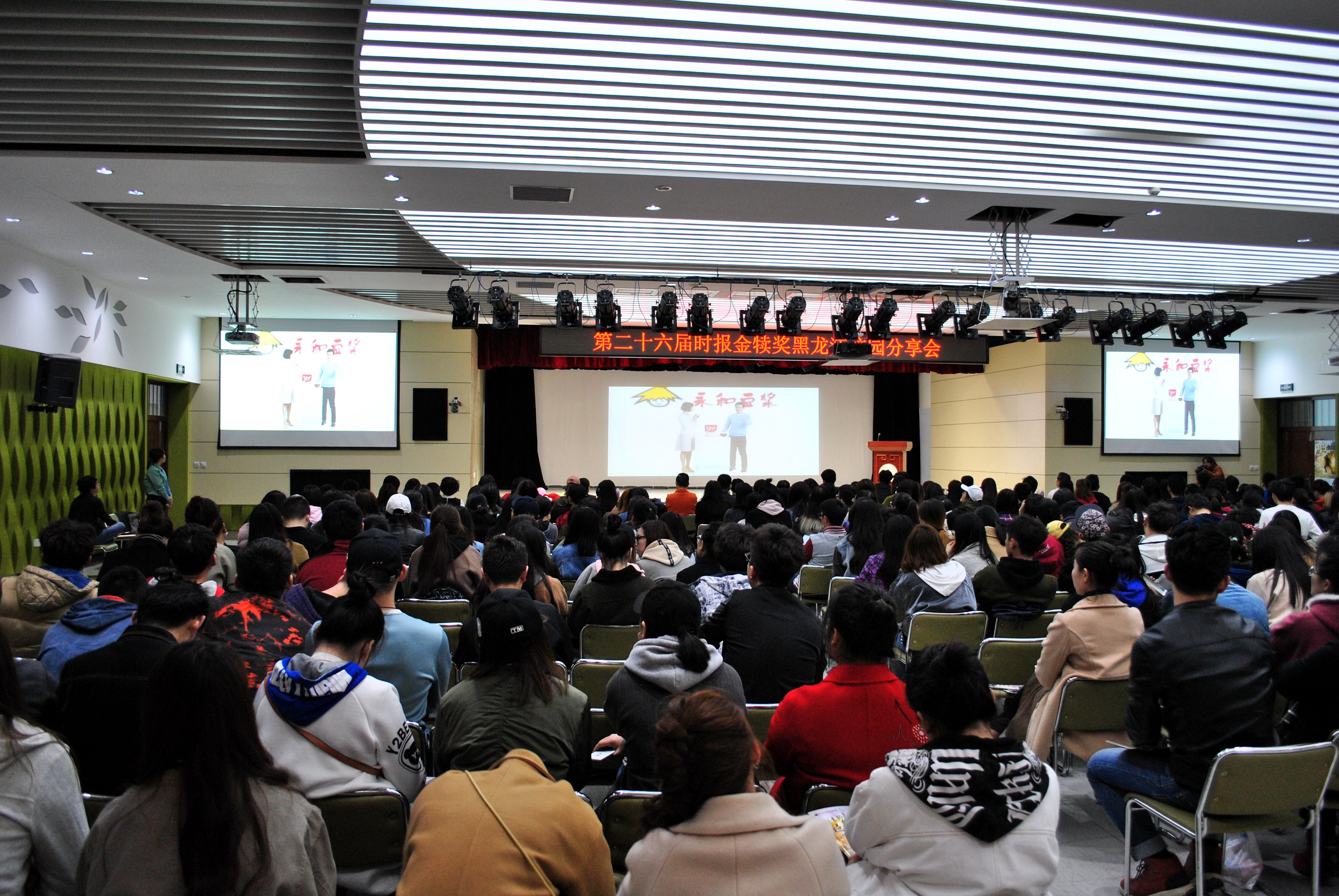 4月12日下午2时,由时报金犊奖主办、东北林业大学文法学院承办的第二十六届时报金犊奖黑龙江校园创意分享会在东北林业大学学生活动中心会议厅举行。东北林业大学、黑龙江省台办、旺旺中时文化传媒、上海费芮网络科技有限公司等单位与来自黑龙江大学、哈尔滨师范大学等8所院校的师生共同参加了此次校园分享会。