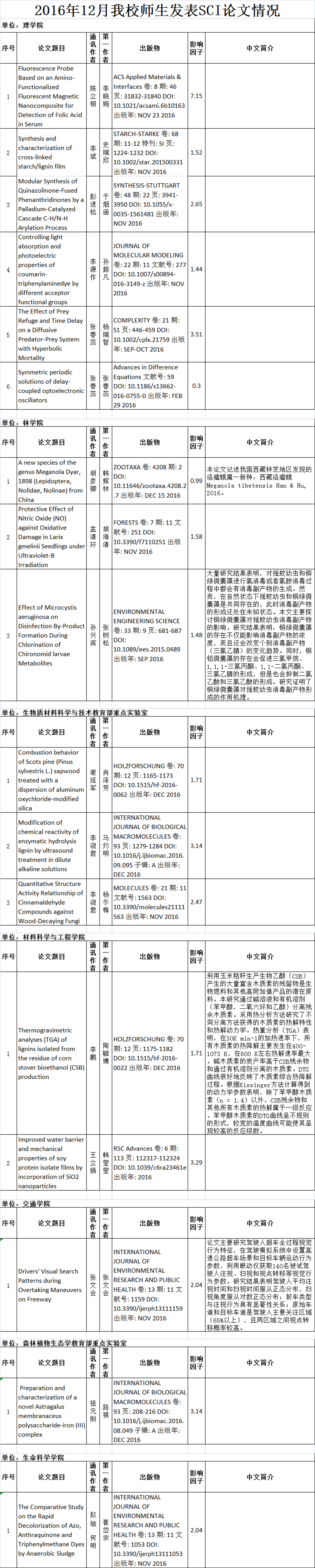 2016年12月,我校师生以“东北林业大学”为第一署名单位发表SCI论文17篇。其中理学院6篇、林学院3篇、生物质材料科学与技术教育部重点实验室3篇。