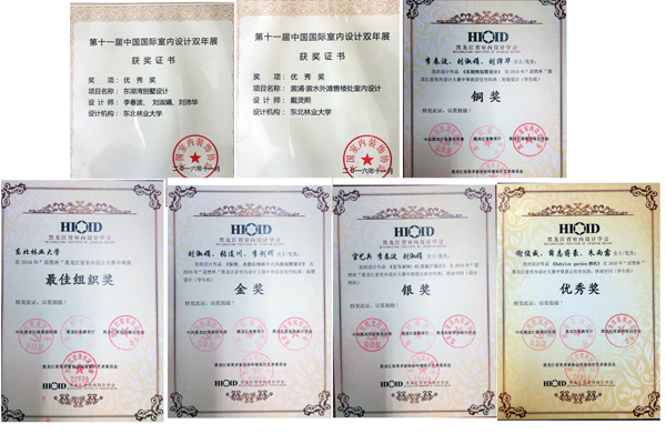 材料科学与工程学院2014级产品设计专业刘淑娟、张连川、李剑晖同学的作品《保利•水韵长滩新中式风格别墅设计》获得大赛别墅设计类金奖;2015级设计学硕士研究生李春波、2014级产品设计专业刘淑娟作品《宝马MINI 4S店展厅设计》获得设计师组银奖;2015级设计学硕士研究生李春波以及2014级产品设计专业的刘淑娟、刘沛华同学的作品《东湖湾别墅设计》获得大赛别墅设计类铜奖;2013级产品设计专业薛志蒋豪、朱雨露同学的作品《Babylon garden酒吧》获得休闲空间类优秀奖。2015级硕士研究生戴灵熙的作品《溆浦•溆水外滩售楼处室内设计》获得商业空间类优秀奖;2013级产品设计专业邱会泽同学的作品《FLOYD(弗洛伊德)简餐酒吧》获得陈设设计奖优秀奖。