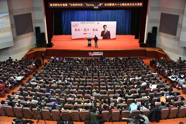 首先,张泽群先生提问现场观众“你为什么要读大学?”、“你为什么来林大?”,由此引出当代大学生对于选择的漠然这一现象。接着他回忆起自己曾想当飞行员却因色弱被迫放弃,随后他历经坎坷,从1982年到1985年一直为考上北京广播学院而努力,在各种磨难和挣扎中坚持四年,最后圆梦北京广播学院的心路历程。“我第一次来到河南人民广播电台考试时,终于发现了自己。”张泽群先生坦言道,原来这个被他称为“读报纸”的专业才是他最喜欢最向往的,而现在90后从小就受到“不能输在起跑线上”的教育观念影响,思想被约束,难以发现真正的自我。他鼓励在座的东林学子真正地去思考自己的人生,不断培养自己的能力,发掘自己真正的兴趣。