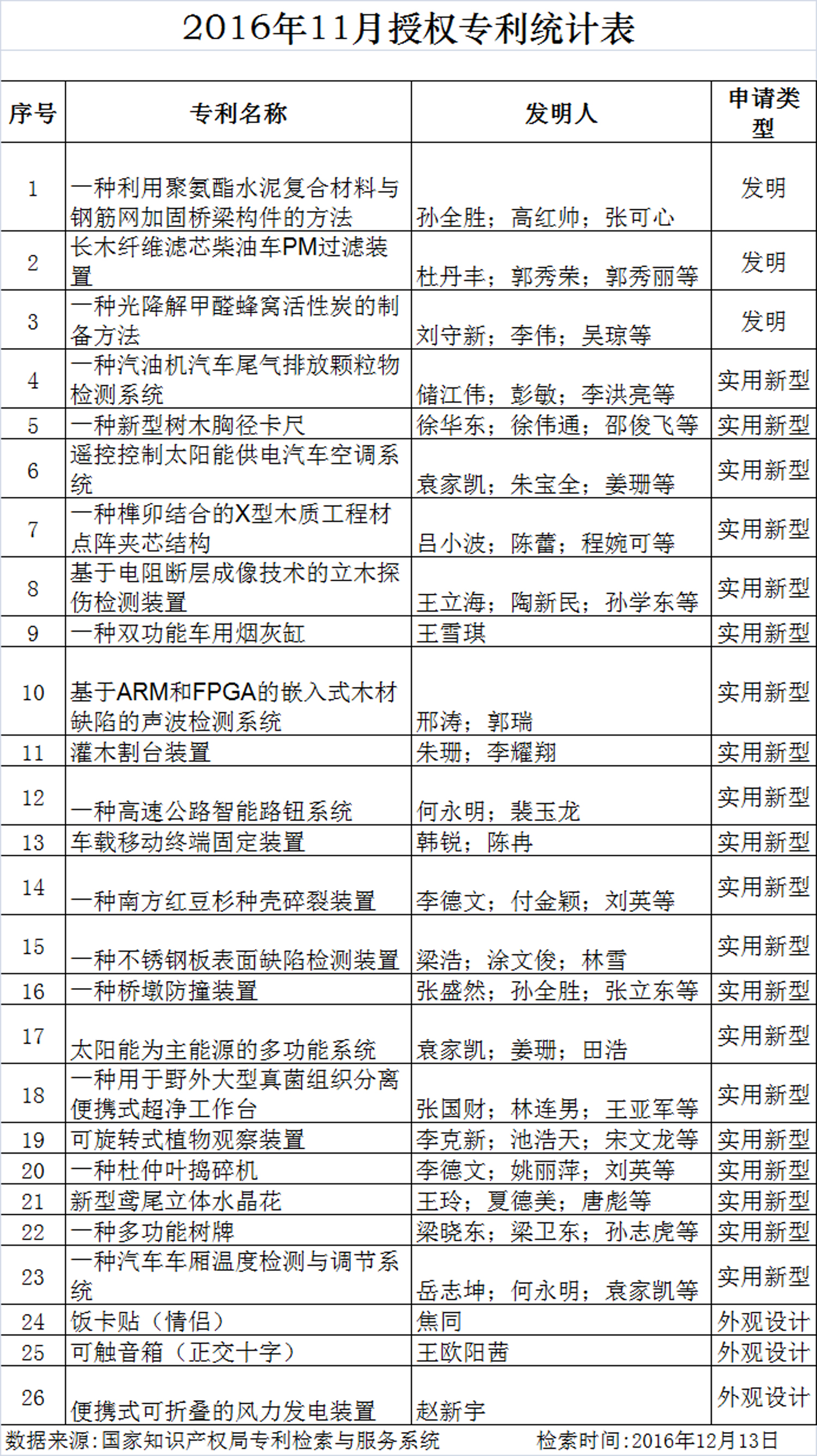 根据国家知识产权局专利检索与服务系统(www.pss_system.gov.cn)的统计数据,2016年11月,我校师生获得专利授权26项,其中发明授权3项,实用新型授权20项,外观设计授权3项。