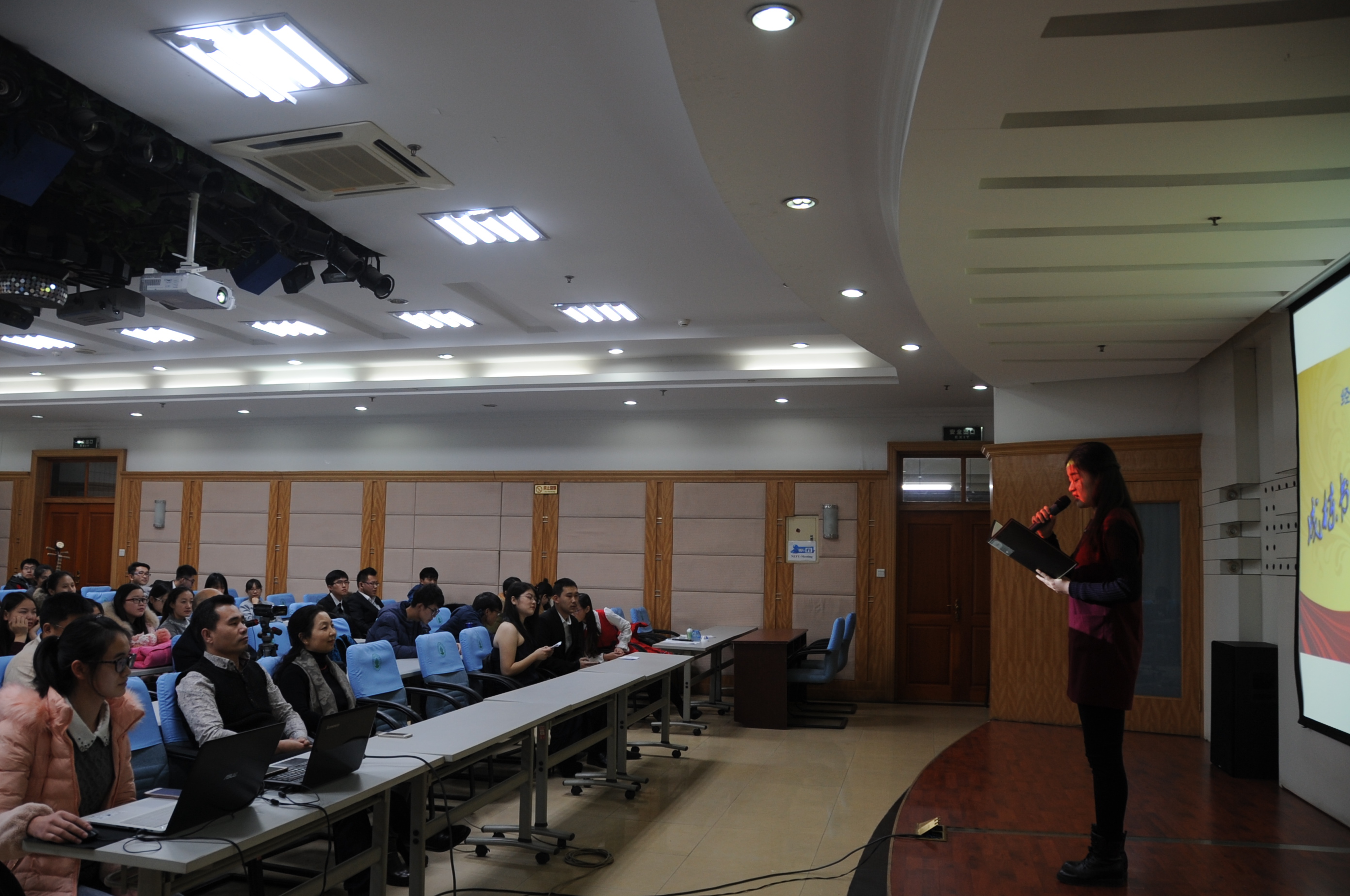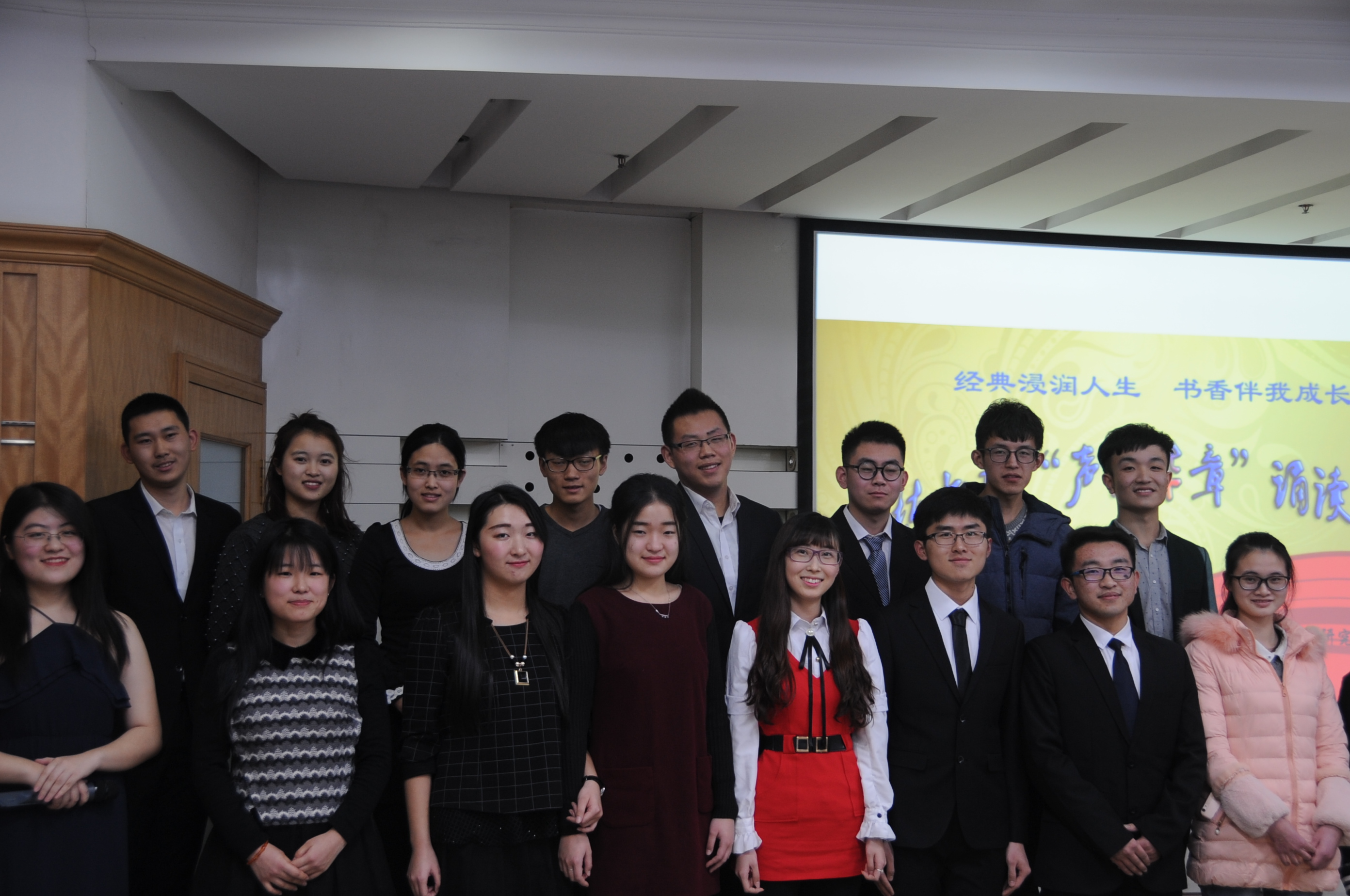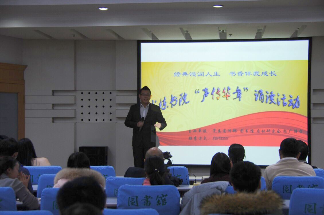 11月26日晚,成栋书院“声传华章”诵读活动在图书馆多功能厅成功举办。此次活动由校党委宣传部、图书馆、启林研究会和校广播台联合举办,旨在丰富校园文化生活,倡导学生用健康高雅的文化艺术陶冶情操。来自我校启林研究会和校广播台的十三名同学为观众们朗诵了9篇中外经典诗篇。朗诵过程中还穿插了琵琶和小提琴独奏,整个活动过程萦绕着高雅的艺术氛围。