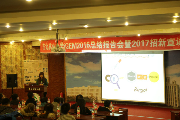 为总结经验、博采众长,继续组织优秀指导教师和各专业的优秀学生加入这一创新团队,让更多专业、更多数量的学生通过这一平台受益,11月17日下午,生命科学学院在动资楼国际会议厅召开了东北林业大学iGEM2016总结报告会暨2017招新宣讲会。理学院院长戚大伟、人事与专家工作处副处长张春雷、校团委副书记李晶才以及生命科学学院党政领导等出席会议,学院部分师生以及对大赛感兴趣的其他学院学生也参加了报告会。报告会上,NEFU-China团队的队员们用流利的英语还原了在波士顿参赛时的情景并回顾了整个参赛准备的心路历程和收获。报告会最后,生命科学学院院长李玉花回顾了学校参加iGEM的历程,并提出相关建议,她表示希望更多优秀学子加入到2017 NEFU-China团队中来,锻炼自己,为校争光。