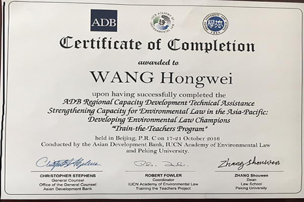 王宏巍是文法学院环境与资源保护法学的学科秘书,长期致力于环境法学的教学和科研工作,并获得了2016年国家社科基金一般项目资助,为文法学院院实现了国家社科项目零的突破,在该领域取得了较为突出的成绩。经过选拔,王宏巍副教授被录取为IUCN环境法学院 “培训培训者”高级研修班的学员,并顺利地通过培训,取得IUCN环境法学院颁发的资格证书。