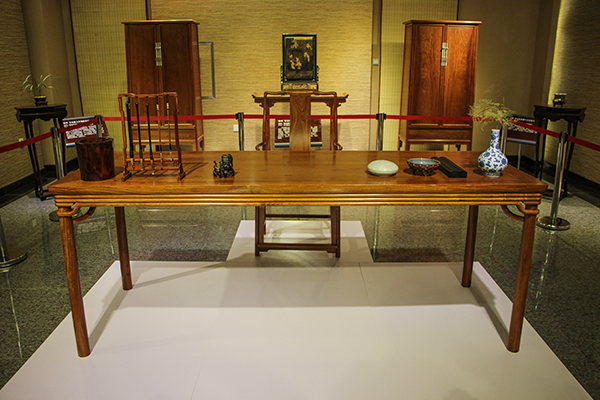 展出的大部分家具,材质是缅甸黄花梨木,价值超过二百万元,其中还有两件的材质为阴沉乌木,是埋藏了上千年不蠹不腐的珍贵木材,其价值更是无法估量。