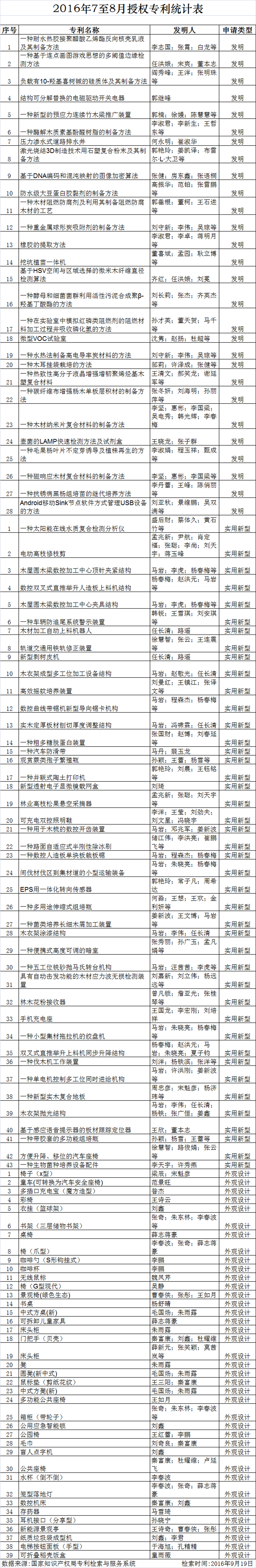 根据国家知识产权局专利检索与服务系统(www.pss_system.gov.cn)的统计数据,2016年7月至8月,我校师生获得专利授权110项,其中发明授权28项,实用新型授权43项,外观设计授权39项。