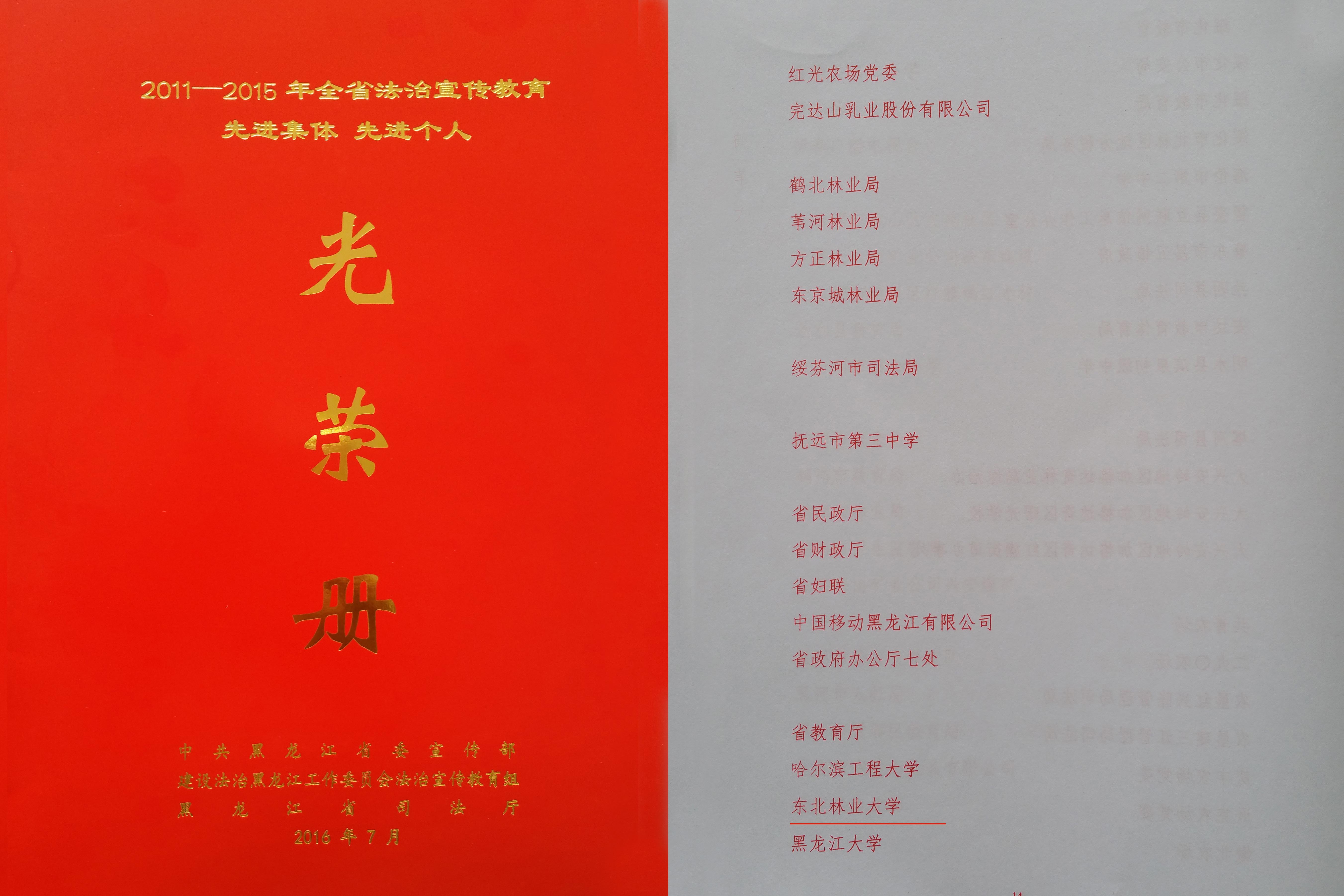 日前,从省委宣传部、建设法制黑龙江工作委员会法制宣传教育组、省司法厅传来喜讯,我校获得“2011—2015年全省法制宣传教育先进集体”荣誉称号。