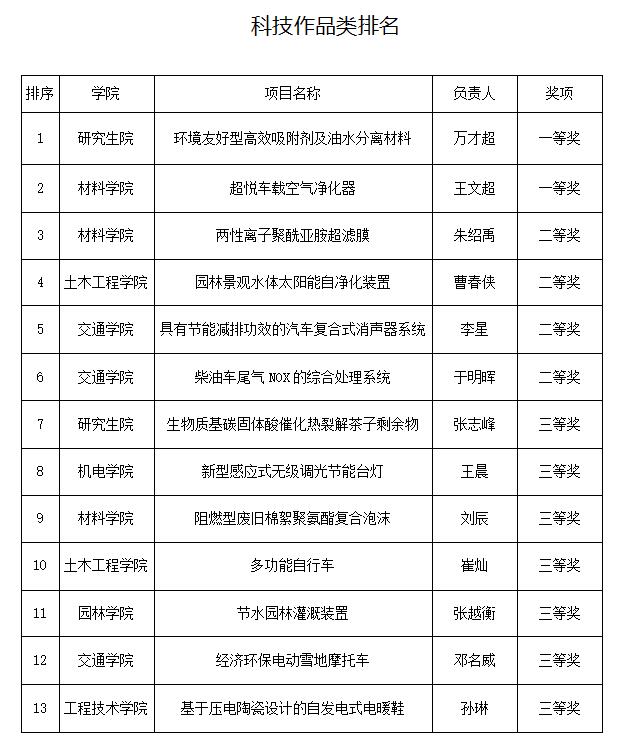 本次校选赛于今年4月份启动,参赛作品分为“科技作品类”和“社会实践调查报告类”两类,自活动举办以来,共收集到科技作品类30份,社会实践调查报告类8份。我校评委根据全国大学生节能减排大赛的评审标准,并结合学院初审排名,对本次节能减排的作品进行了细致的评阅,并对一些作品提出了修改意见,确定了校赛的获奖排名。资产与后勤管理处以“促进作品成果转化”为原则,遴选了《节水园林灌溉装置》《节能减排 绿漾青春》两项作品,将在作品与校园节能工作结合开展落地转化等方面提供一定资金支持,同时将对一、二、三等奖作品给予奖励。