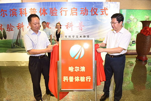 最后,哈尔滨市科协党组书记、副主席王凯甲,东北林业大学党委副书记、副校长孙正林两位领导为哈尔滨科普体验行活动揭幕。并为哈尔滨科普体验行试点单位——哈尔滨工程大学启航中心、东北林业大学中国(哈尔滨)森林博物馆、哈尔滨森鹰窗业集团科普基地、松松小镇等授牌。