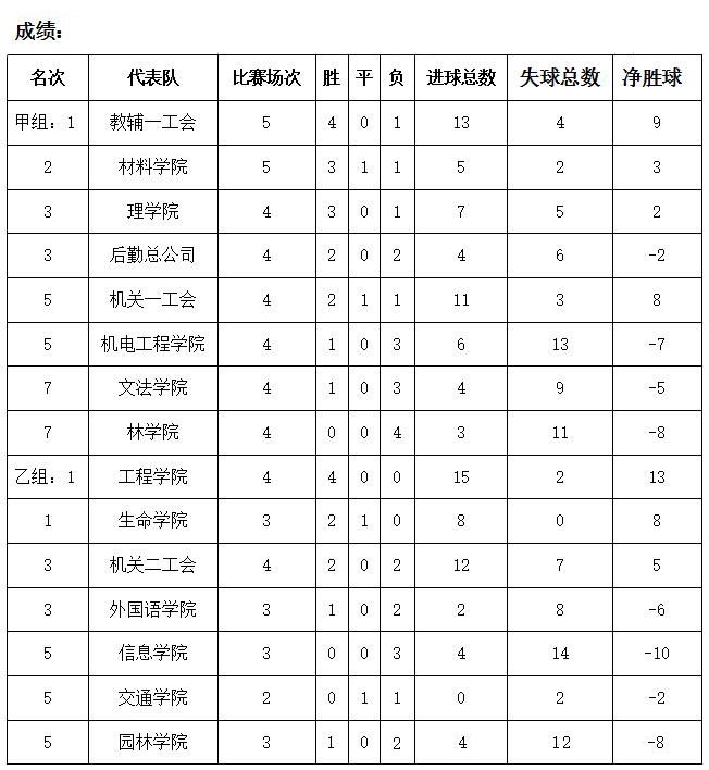 伴随着欧洲杯的落幕,我校教职工2016年足球赛于7月8日在田径体育场也吹响了终场哨声,经过10个比赛日的角逐,最终教辅一工会获得冠军,材料科学与工程学院获得亚军,理学院与后勤服务总公司获得季军。生命科学学院与工程技术学院晋升甲级队。