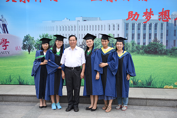 学校领导杨传平校长在主楼前与毕业生合影留念