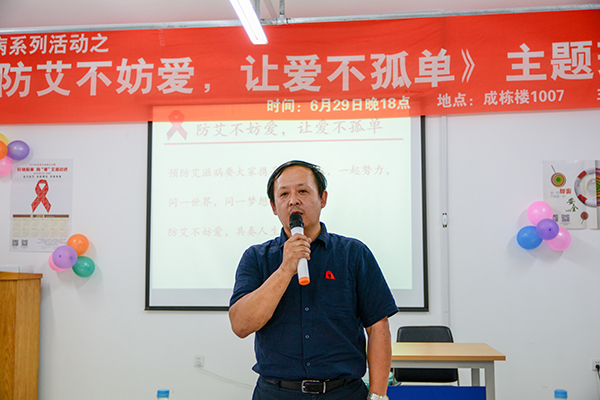 “我志愿成为抗击艾滋病的一员,主动了解艾滋病的相关信息,保护自己,与朋友、家人分享知识和经验,积极向社会宣传艾滋病防治知识,关爱和支持受艾滋病影响的同伴和家庭,与伙伴们携起手来,共同承担社会责任,共同抗击艾滋病。”暴雨后的成栋楼内,传来声声温暖有力的宣誓声,学校艾滋病防控试点工作领导小组组长、副校长李顺龙,此刻也与在场学生一样,高举右拳,认真跟读,胸前佩戴的红丝带格外显眼。