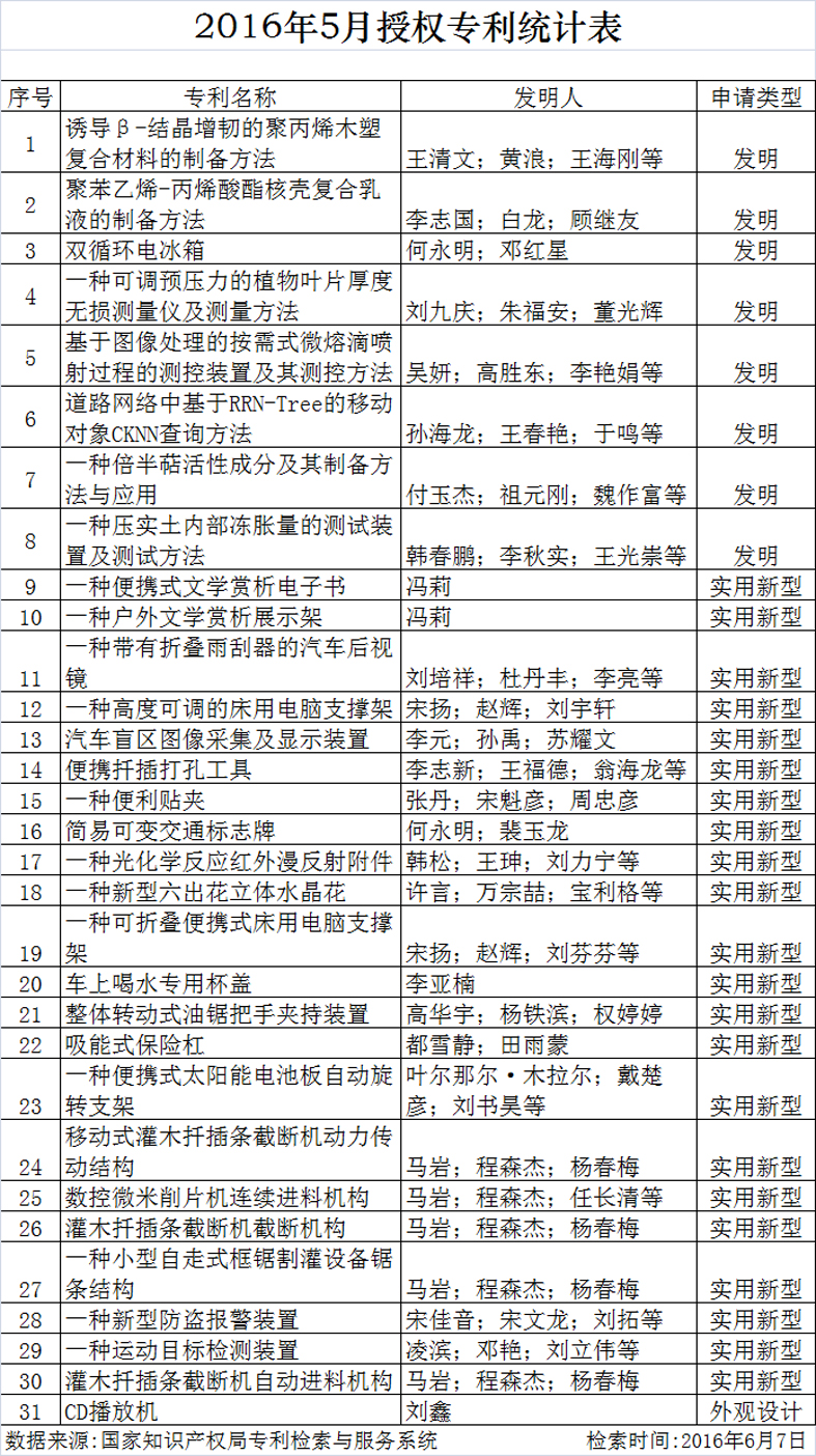 根据国家知识产权局专利检索与服务系统(www.pss_system.gov.cn)的统计数据,2016年5月,我校师生获得专利授权31项,其中发明专利8项,实用新型专利22项,外观设计专利1项。