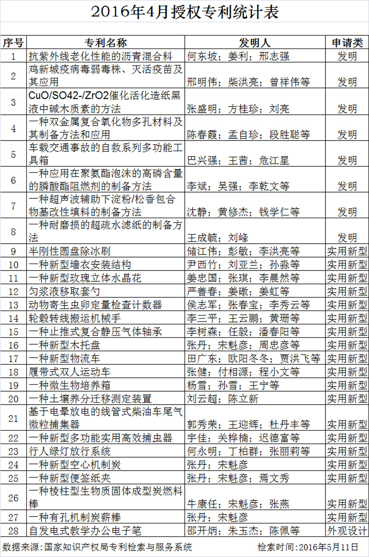 根据国家知识产权局专利检索与服务系统(www.pss_system.gov.cn)的统计数据,2016年4月,我校师生获得专利授权28项,其中发明专利8项、实用新型专利19项、外观设计专利1项。