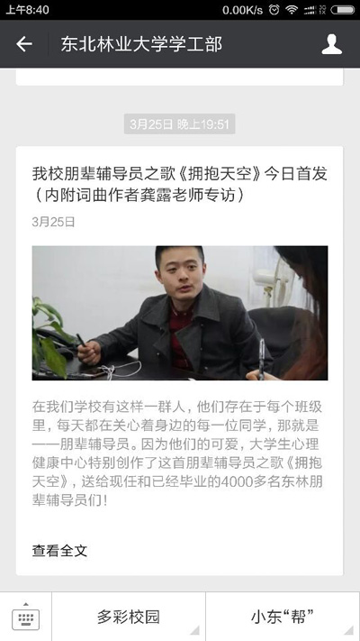 3月25日,我校朋辈辅导员之歌《拥抱天空》在优酷视频、腾讯视频以及学校党委学工部官方微信平台同步正式发布,截至目前,点击阅读量已近3000。