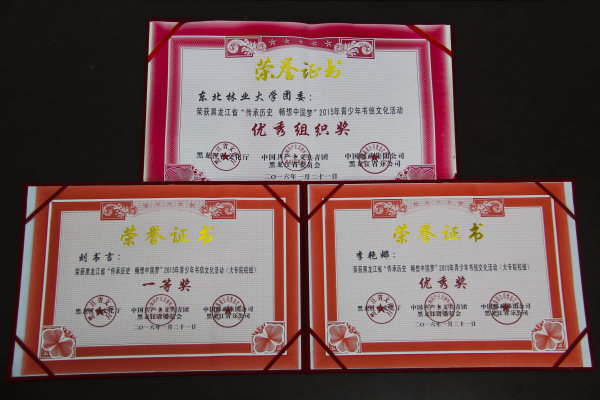 近日,由省文化厅、团省委、中国邮政黑龙江省分公司、新浪黑龙江、龙广高校台共同主办的“传承历史畅想中国梦” 黑龙江省2015年青少年书信文化征集活动评选结果揭晓,我校野生动物资源管理学院刘书言、机电工程学院李艳娜两位同学分获大专院校组一等奖和优秀奖,我校获“优秀组织奖”。