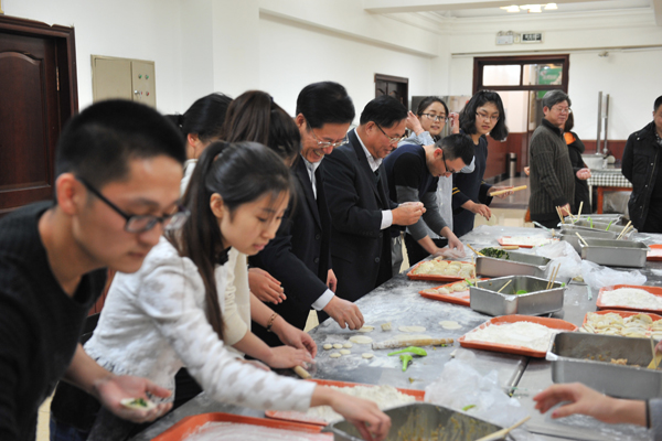 校领导与留校学生代表包饺子
