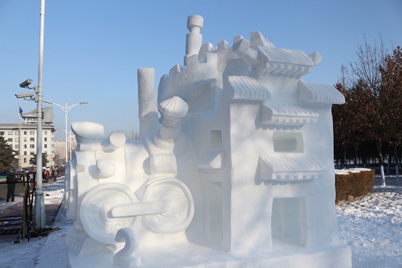 我校学生参赛作品“雪国列车”立意深远,表达了对哈尔滨这座古城深深地敬意。作品由火车头、长城、哈尔滨老道外建筑群等为主要构成元素。哈尔滨地处东北亚中心地带,被誉为欧亚大陆桥的明珠,是第一条欧亚大陆桥和空中走廊的重要枢纽,也是中国著名的历史文化名城、国际冰雪文化名城,有着悠久的铁路文化历史。哈尔滨通过铁路将西方的先进文化带入中国,也希望中国能够通过哈尔滨将中国文化传遍世界,这便是此次作品的寓意。