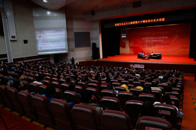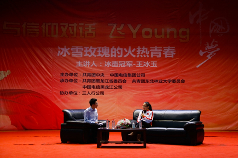 “冰壶的出现一下子就把我抓住了,这就叫一见钟情吧”,王冰玉如是说。出生于体育世家的她,在接触到冰壶这项运动后就深深地爱上了这项运动。在谈到中国女子冰壶队的发展时,她感慨颇深,虽然面对训练条件的艰苦、作息时间的不规律、外教等级低、没有专门的训练场加上我国冰壶起步慢等一系列的问题,但她们迎难而上、精诚团结,用情比金坚的友谊,不断克服难题,逐渐完成从业余队到专业队再到国家队的华丽蜕变,并不负众望地在世界锦标赛上为中国夺得桂冠。当她说道:“国际上认为十五年中国队能进入世锦赛,结果我们仅仅用了三年就进世锦赛,五年就拿冠军。”全场自发响起热烈的掌声。