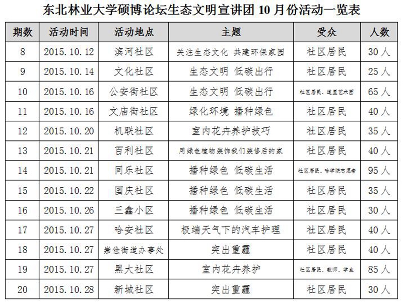 2015年10月东北林业大学“硕博论坛”生态文明宣讲团深入哈尔滨市各街道社区、学校等,陆续开展了十几期生态文明宣讲及图片展,现场参与千余人次。