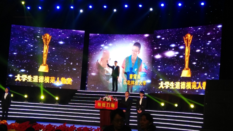 10月27日下午,2014-2015年度黑龙江省高校教师、大学生年度人物暨道德模范人物(群体)评选活动的颁奖典礼在东北农业大学音乐厅隆重举行。我校野生动物资源学院教师肖向红、野生动物资源学院2012级学生刘书言、机电工程学院2012级学生曹雪甫分别获得2014-2015年度黑龙江省高校教师年度人物奖、黑龙江省大学生年度人物奖和黑龙江省大学生道德模范人物奖。