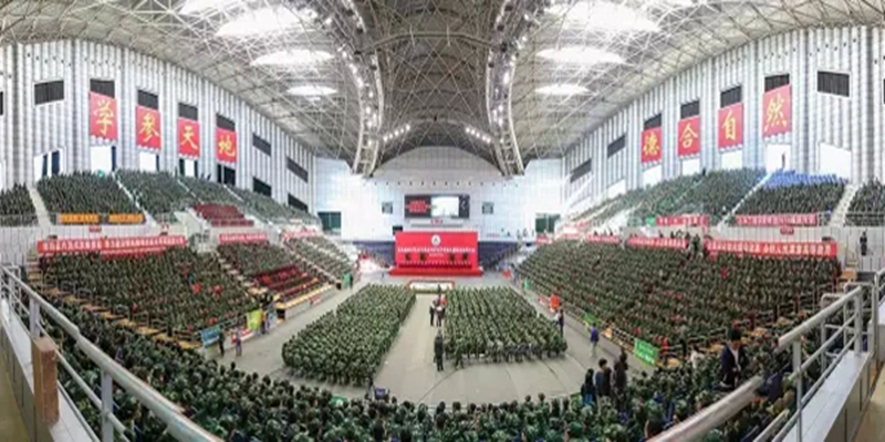 9月14日上午,2015级本科学生开学典礼在我校体育馆隆重举行。学校领导、中国工程院院士、各学院院长、相关职能部门负责人参加了开学典礼。4726名2015级本科新生穿着迷彩服参加了开学典礼。开学典礼由副校长李斌主持。