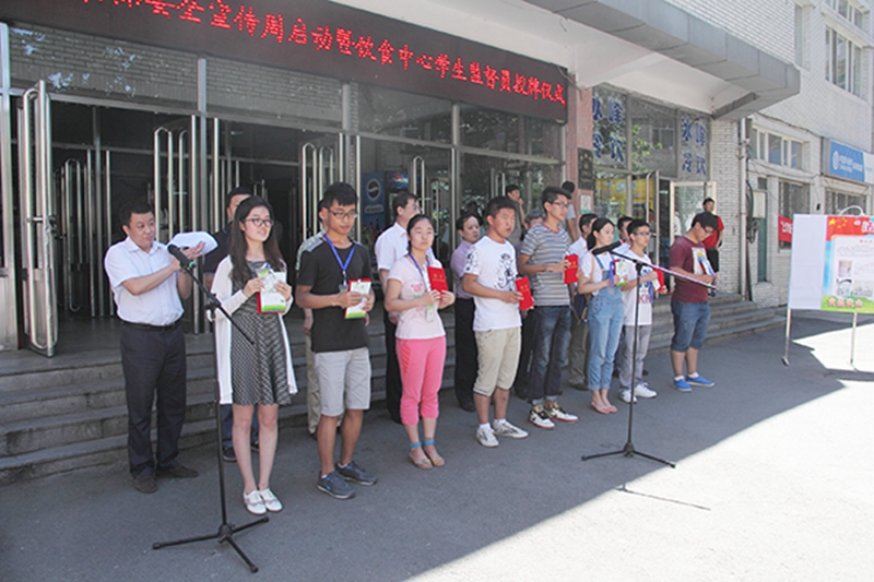 6月30日10时,在饮食中心三号门前,我校2015年食品安全宣传周启动暨饮食中心学生监督员授牌仪式成功举行。今起,30名来自各学院、各年级的学生监督员将对饮食中心的食品安全、服务、场所环境等进行监督。据了解,这是我校首次设立学生监督员。