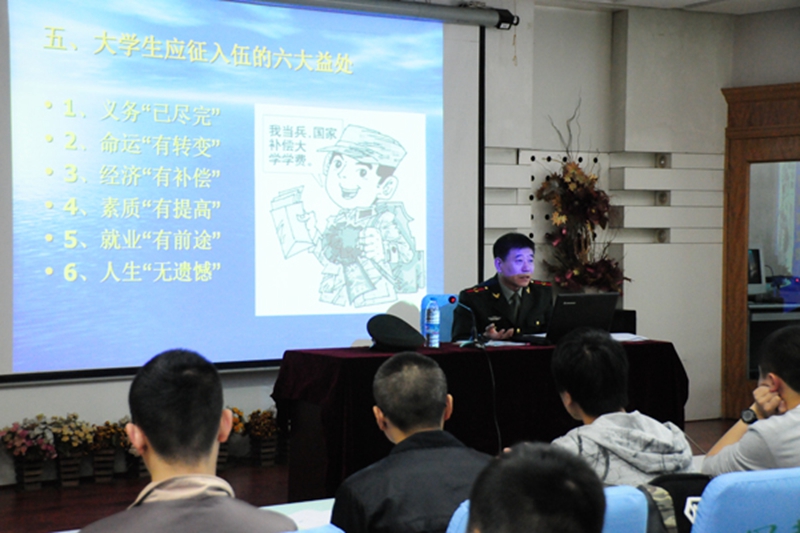陈国华老师从为什么在大学生中征新兵、我校历年征兵情况、应征入伍基本政策、大学生入伍优惠政策、大学生入伍的益处、应征入伍所需要的准备以及报名地点等七个方面对应征入伍政策进行了介绍。