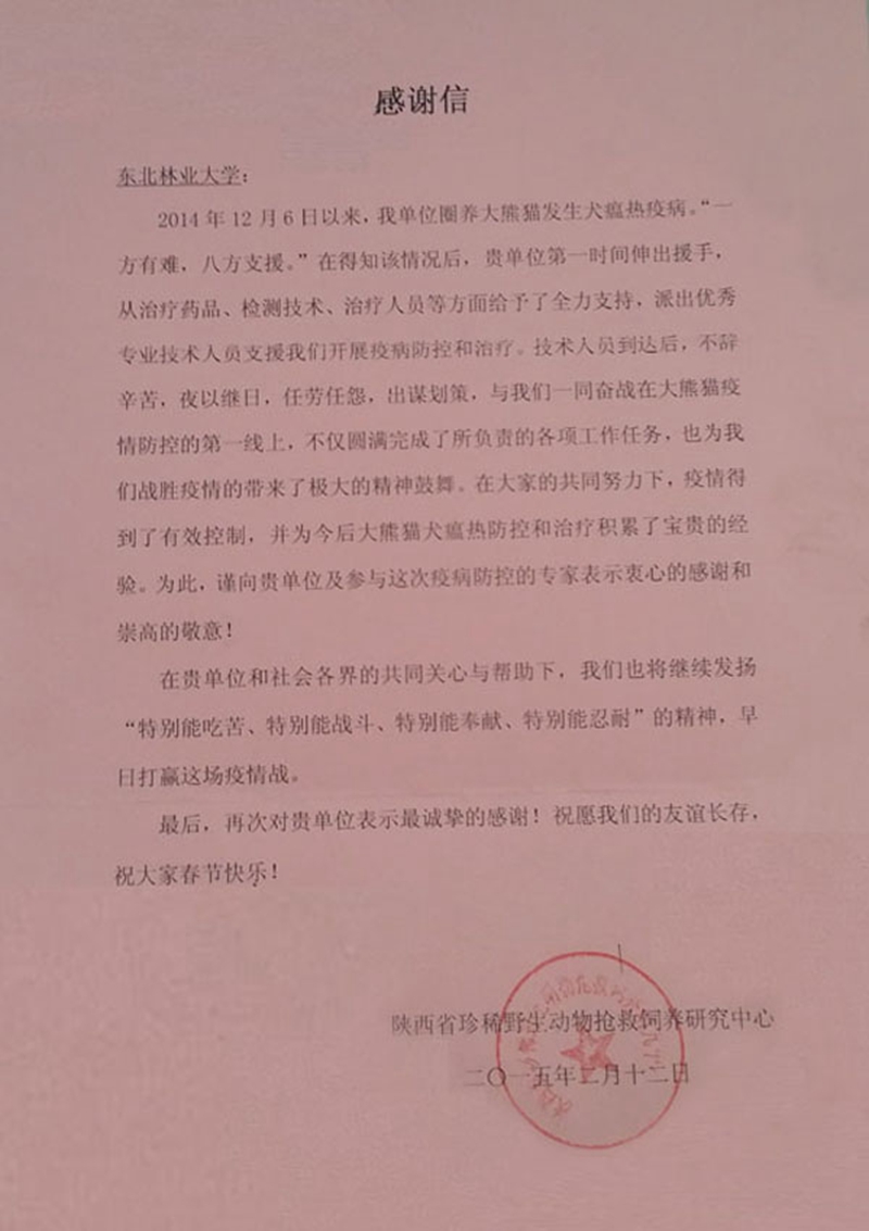 近日,我校接到来自陕西省珍稀野生动物抢救饲养研究中心的感谢信,感谢我校专家华育平在大熊猫发生犬瘟热疫病时,在第一时间伸出援手,为熊猫出诊治疗。