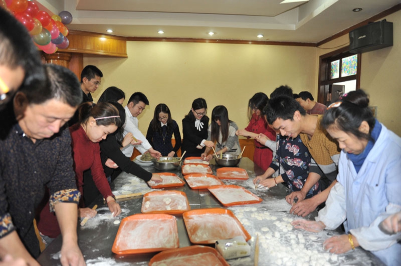 “呀,师兄你还会包花边饺子呐。”“你这饺子形状怎么这么奇怪?”“负责包硬币的不许作弊啊!”……在一片欢声笑语中,留校学生与学校领导、后勤服务总公司的领导、各学院党委副书记、辅导员们一起热热闹闹地包完了饺子。