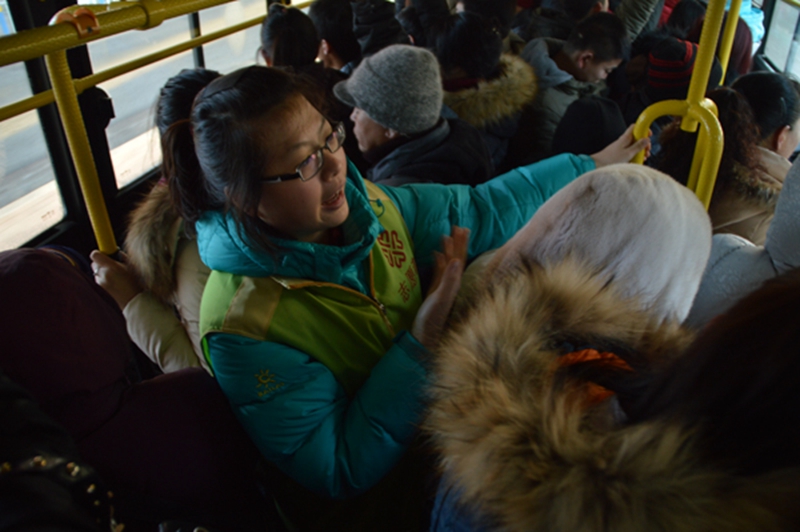 “请大家有序排队,文明乘车”“请大家抓好扶手,避免拥挤碰撞”“哪位热心的乘客可以为这位奶奶让一个座位啊”,早上6:00开始到晚上17:30结束,7条线路的公交车上回荡着志愿者们的“动人旋律”。志愿服务活动中,志愿者们充分展示了我校志愿者的良好风貌,不畏严寒、不辞辛苦,用似火的热情和过硬的技能服务他人。