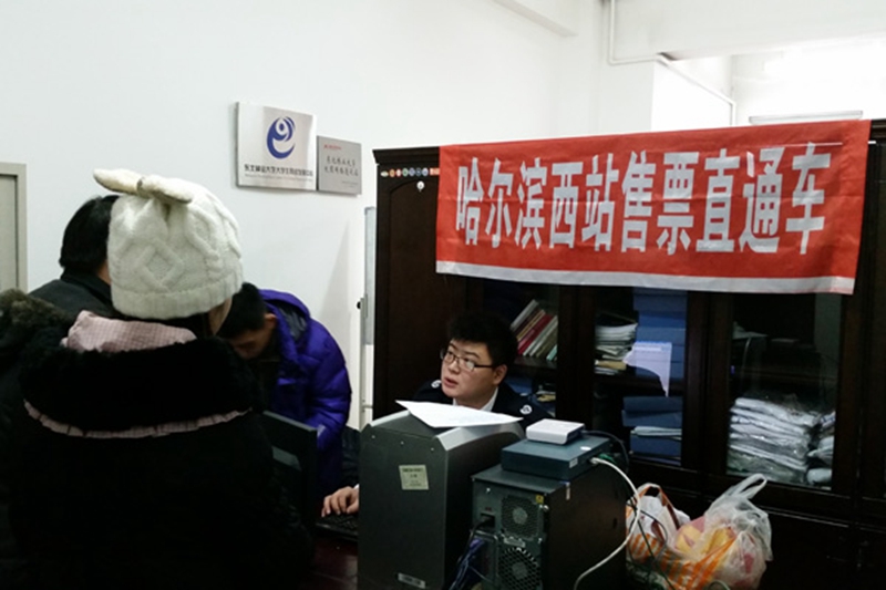 寒假将至,为给学生提供更加便捷的服务,方便寒假返乡的学生购买火车票,经与哈尔滨西客站联系,特邀请了哈尔滨西客站工作人员到我校为学生们开设专门售票窗口,现场为学生办理购票、取票、换票等业务,并帮助学生解答订票时遇到的疑难问题。这种零距离售票方式为学生带来了优质、快捷、方便的购票服务,解决了回家购票难、取票难等问题,也为学生们安心做好期末复习备考节省了时间。