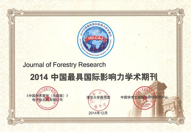 《林业研究》(英文版)继2013年获得“中国国际影响力优秀学术期刊”后,2014年又荣获“中国最具国际影响力学术期刊”,进入科技类期刊TOP5%。