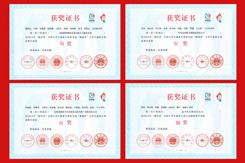 此外,在“创青春”全国移动互联网创业专项赛事中,连博琳等同学的《盛世博远网络科技传媒有限公司》和张春姝等同学的《合能网络科技有限公司》两个项目获得铜奖。