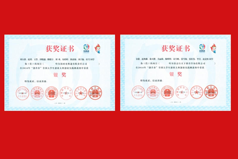 经过国赛终审决赛的角逐,创业实践挑战赛金毅等同学的《哈尔滨志行天下教育咨询有限公司》、刘大睿等同学的《哈尔滨时光慢递有限责任公司》荣获银奖,并成为全国首批“青创板”挂牌企业;创业计划竞赛张丽静等同学的《东林德然林下经济贸易与技术推广有限责任公司》、魏靖达等同学的《北纬路桥测量设备有限公司创业企划》、李论等同学的《哈尔滨煦航节能保温装饰公司》获铜奖;公益创业赛张彤等同学的《益书吧有限责任公司》项目获铜奖。