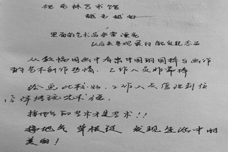 许多同学参观后纷纷在艺术馆的留言板上写下了自己的感受与对展览的美好期许。他们赞叹国粹艺术的丰富内涵,他们夸赞草根艺术对生活的完美诠释,并对工作人员的耐心讲解“点赞”,“希望艺术馆能举办更多的展览活动,有更多画家的作品供同学们观赏,让我们有机会更好的学习艺术文化知识。”(文:孙阔;图:刘雨婷、尹智洋)