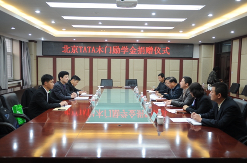 10月28日下午,北京TATA木门有限公司董事长吴晨曦一行3人来校捐赠励学金。校长杨传平和学校相关部门负责人参加了在综合办公楼808会议室举行的捐赠仪式。
