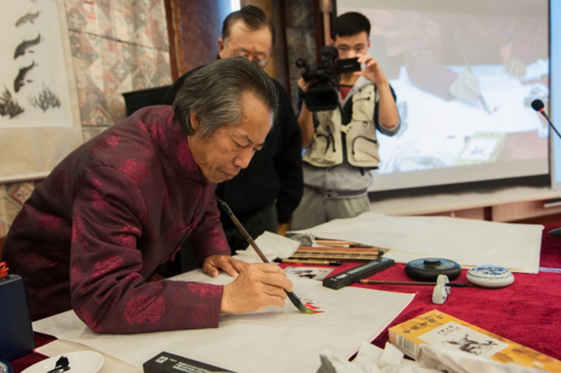 互动环节,王齐先生为四位微信集赞和现场互动的同学赠送了自己的墨宝,并现场作画,为大家讲解如何简单创作国画,多位同学围在画台前现场跟随王老先生学习作画,讲座变为了国画现场讲学课,同学们纷纷请老先生在自己的画作上留下墨宝并合影留念。(侯利军)