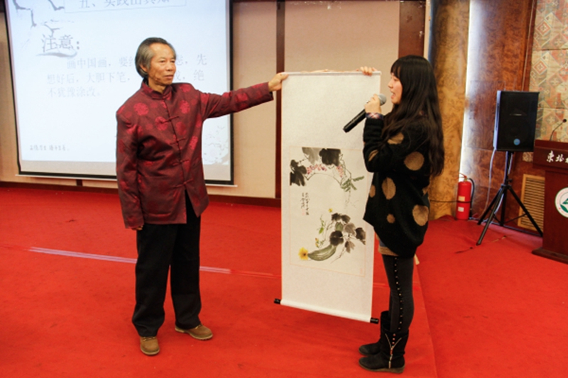 王齐先生以时间为轴,介绍了自战国至今的书画大家以及名作,他列举写意大家蒋雨浓先生等著名画家的经历,细说“乐观”一词:没有笔墨纸砚,就自己扎笔,用破碗洗笔;没有桌椅,就用门板,甚至用“指画”、“舌画”,靠写画支撑精神,老先生对这些在艰苦环境下依旧坚持的画家们赞不绝口,引起现场观众的共鸣。提及自己的书画生涯,王齐先生概括为爱画、坚持、低碳、拜师、尊师这五个词,“年轻时,每逢过年,为乡亲们作画连饭都吃不上,有时候早上三四点就起来作画”,这就是老先生能用五分钟画鸡,而别人得用半天时间才能完成的秘诀。天道酬勤,齐白石先生“十年画形,十年画神”,蒋雨浓先生“六十余载方知中国画在水中的独特风格”,这正如王齐先生所说的“一个画家、艺术家、都不容易,不管做什么都不容易,所以要认真去做”,王齐先生以自己的口号“不要嫌老没出息,更待扬鞭催马自奋蹄”与在场观众共勉。在“学画体会”方面,王齐先生给出了“作画要有动感,要有情”的建议,他调侃道,中国的水墨画就是玩水玩墨,但要学会适当搭配,要有那种“淡妆浓抹总相宜”的感觉。谈到临摹,王齐先生认为,它是有阶段的,不能依赖临摹,一人一画法,并以他自己的作品《春》《夏》《秋》《冬》为例向同学展示。他强调,画中国画,要经深思熟虑,先想好后,大胆下笔,一气呵成,绝不悔改,坦中华之风,荡九州之魂。随后,王齐先生耐心地教导在场观众如何欣赏国画,并列举韩长悦等现代画家的作品进行点评,提出作画要存物于心,画出神韵,以兴写神,以神写意,骨法用笔,以书入画,追求意境,缘物寄情,有主有辅。最后,他还赠言现场师生:每人至少培养一项兴趣爱好,并且坚持下去,丰富自己的人生!