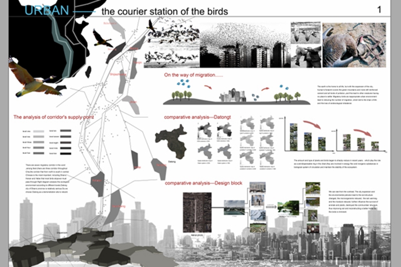 我院获奖作品的竞赛题目为“URBAN——The Courier Stafiom of the Birds”,内容是针对鸟类迁徙栖息地进行保护的景观途径。竞赛主题新颖独特,构思来自仿生学的植物根系的养伤交换。设计的核心内容是通过仿生学与生态技术的巧妙结合,提出了促进鸟类迁徙栖息地恢复与保护的技术方法。(许大为)
