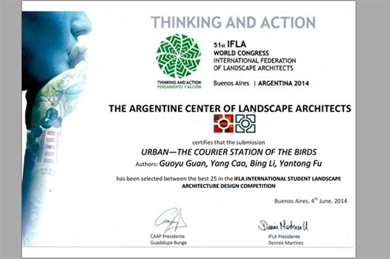 在2014年国际风景师联合会(IFLA)组织的全球风景园林专业大学生设计竞赛中,由园林学院许大为教授指导的3名研究生关国宇、曹阳和白研彤获得入围奖。来自世界各国高校和科研机构风景园林专业的研究生和本科生参加了本次竞赛,全球共设入围奖25名。